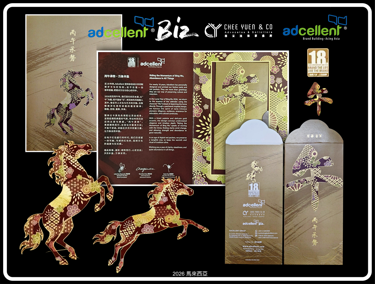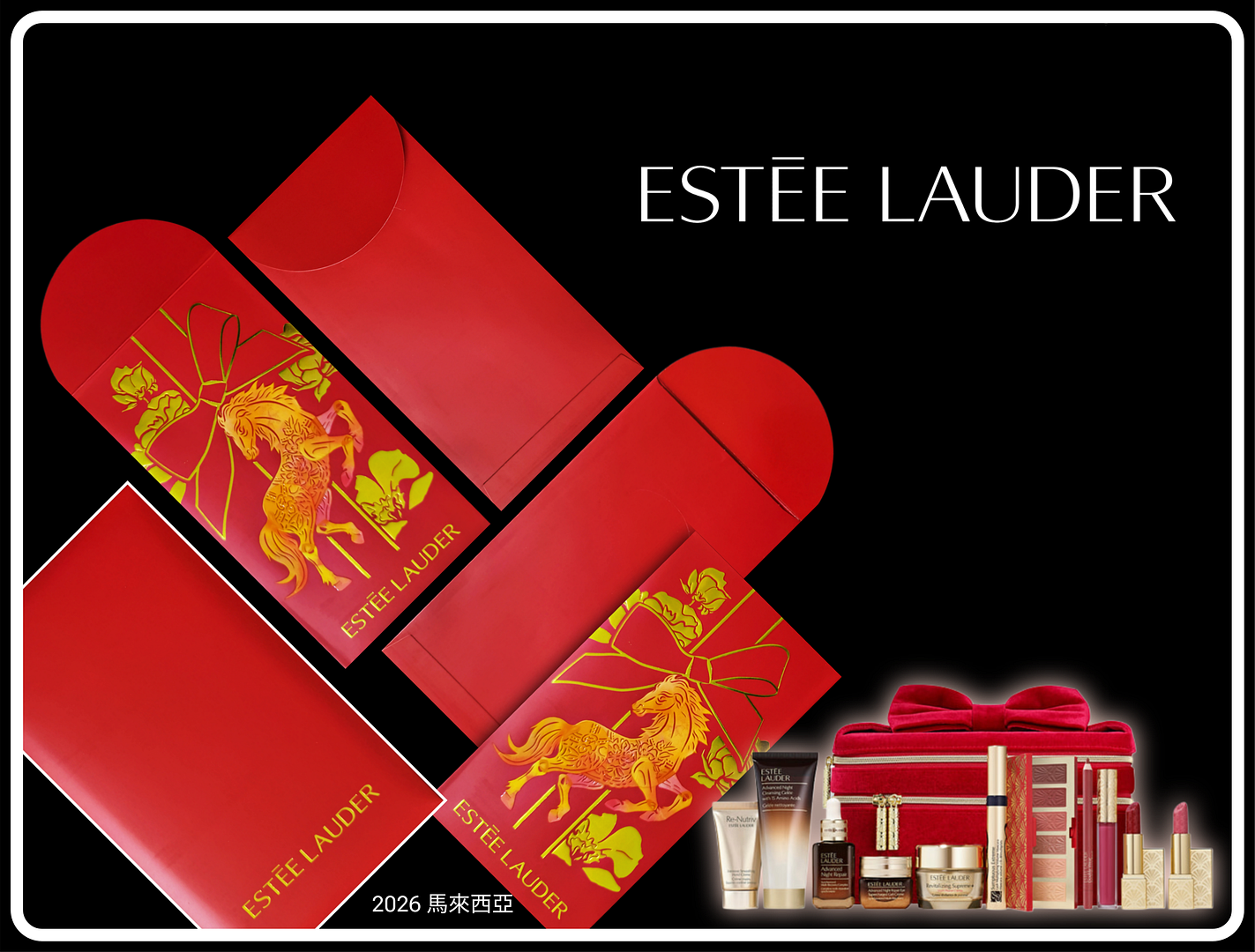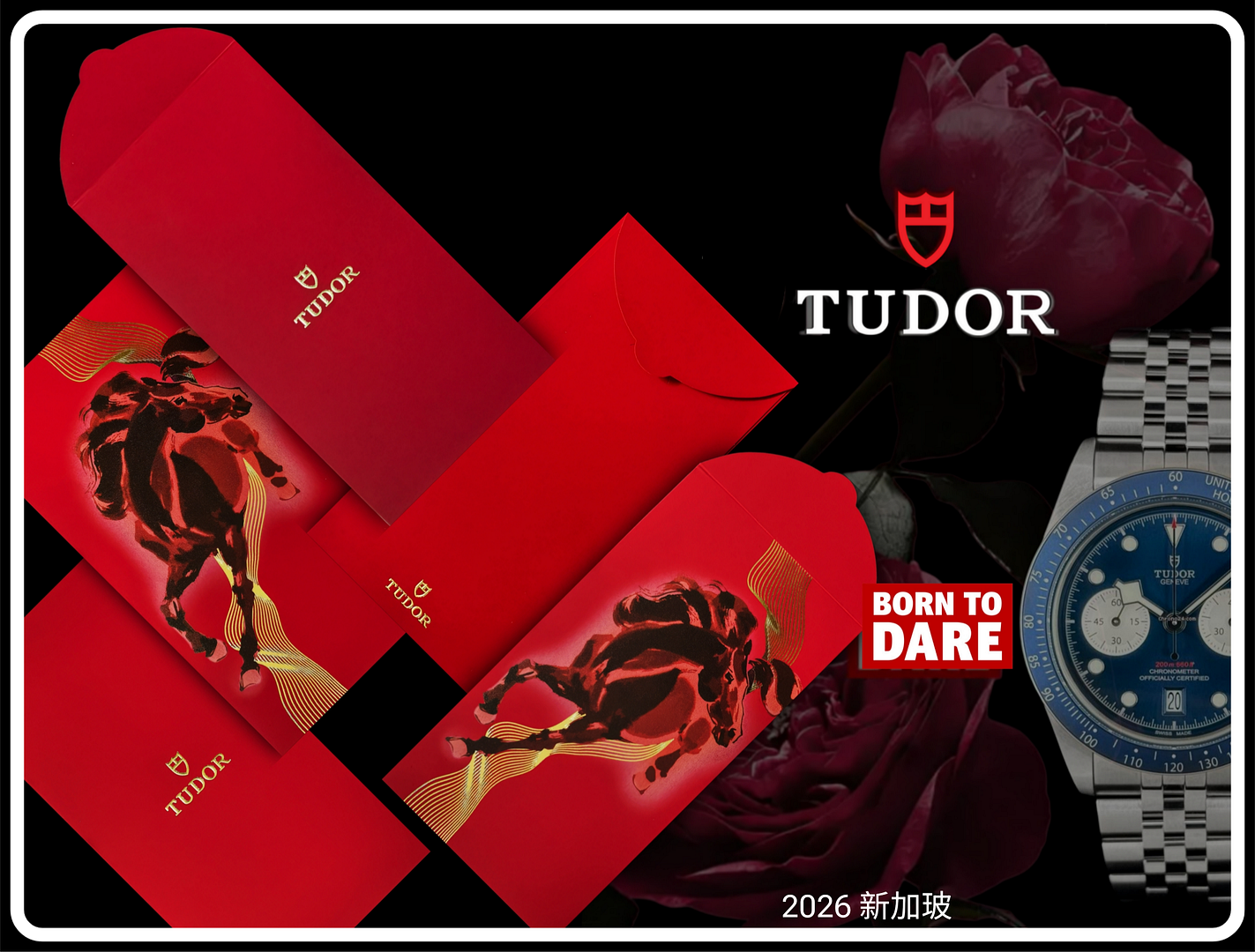 黃埔天地推出「駿馬獻瑞利是封」,整體設計融合傳統文化與現代美學,選用象徵吉祥與熱情的緋紅為底色,上面以金色流線勾勒出一頭躍然奔騰、氣勢非凡的祥馬剪影。馬身主體由深淺不一的銅錢圖案構成,祝願財源滾滾、大富大貴;在其之上以燙金及浮雕技術細緻描繪了繁花盛放、祥雲繚繞、仙鶴展翅等精緻花紋,寓意百花齊放,福氣臨門,前程似錦。栩栩如生的祥馬奔騰而來,送上新春佳節的喜慶與祝福。