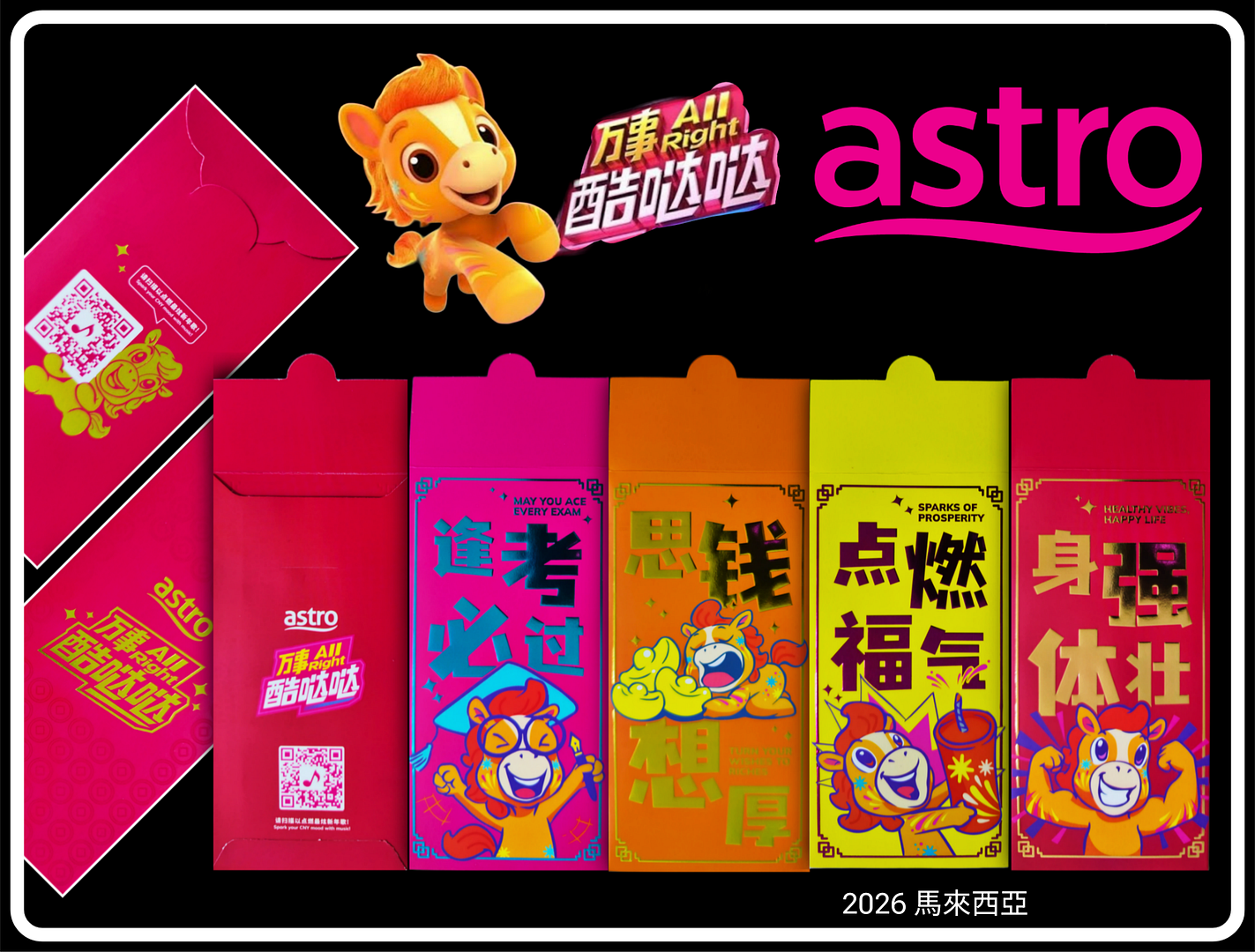 南豐旗下商場馬年利是封+AIRSIDE南豐集團旗下AIRSIDE、Nan Fung Place、馬鞍山中心、將軍澳廣場、為大家準備四款新春利是封,同賀豐足新年。AIRSIDE聯乘韓國插畫《ZIZONE》推出一套兩款利是封,「食極唔肥」利是封以主角粉紅貓PINGO為主,祝福大家新一年享用美食之餘保持身形;另一款「馬力十足」利是封印上一眾主角坐於跑車上的英姿,配上應節生肖小馬。至於另一款「AIRSIDE躍動小馬」利是封以駿馬為主角,由卡通小馬帶來馬運亨通祝福,祝各位財源廣進。